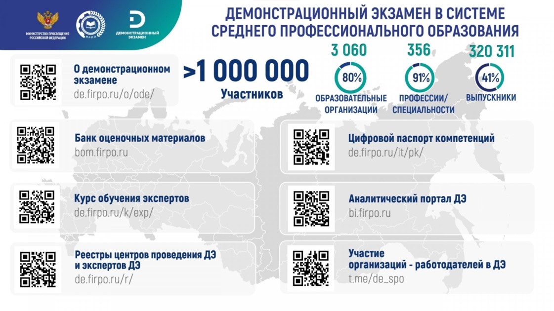 В соответствии с приказом Министерства просвещения Российской Федерации от 17 апреля 2023 года № 285 Институт развития профессионального образования является оператором демонстрационного экзамена базового и профильного уровней по образовательным программам среднего профессионального образования. Подробнее с направлениями деятельности Института развития профессионального образования как оператора демонстрационного экзамена Вы можете ознакомиться по ссылке: https://de.firpo.ru/o/op/.