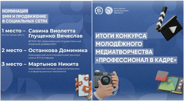 Проект Красноярского государственного аграрного университета «АГРОКОМПАС | Твой путь в будущее» стал победителем конкурса молодёжного медиатворчества в номинации «SMM и продвижение в социальных сетях». Организатором выступил Центр развития профессионального образования Красноярского края.