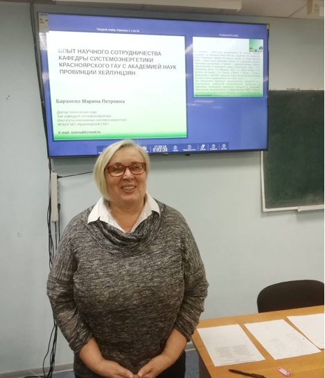 В своем докладе «Опыт научного сотрудничества кафедры системоэнергетики Красноярского ГАУ с Академией наук провинции Хейлунцзян (КНР)» д.т.н., профессор, зав. кафедрой системоэнергетики Марина Петровна Баранова рассказала о своей недавней поездке в Китай на ежегодный международный научный форум, совместных научных исследованиях с китайскими учеными, подчеркнула роль системного подхода при организации в КНР просвещения, высшего образования и науки, изменившего облик этой страны за 50 лет - от отсталой и нищей страны до одной из самых технологичных и процветающих экономик мира.