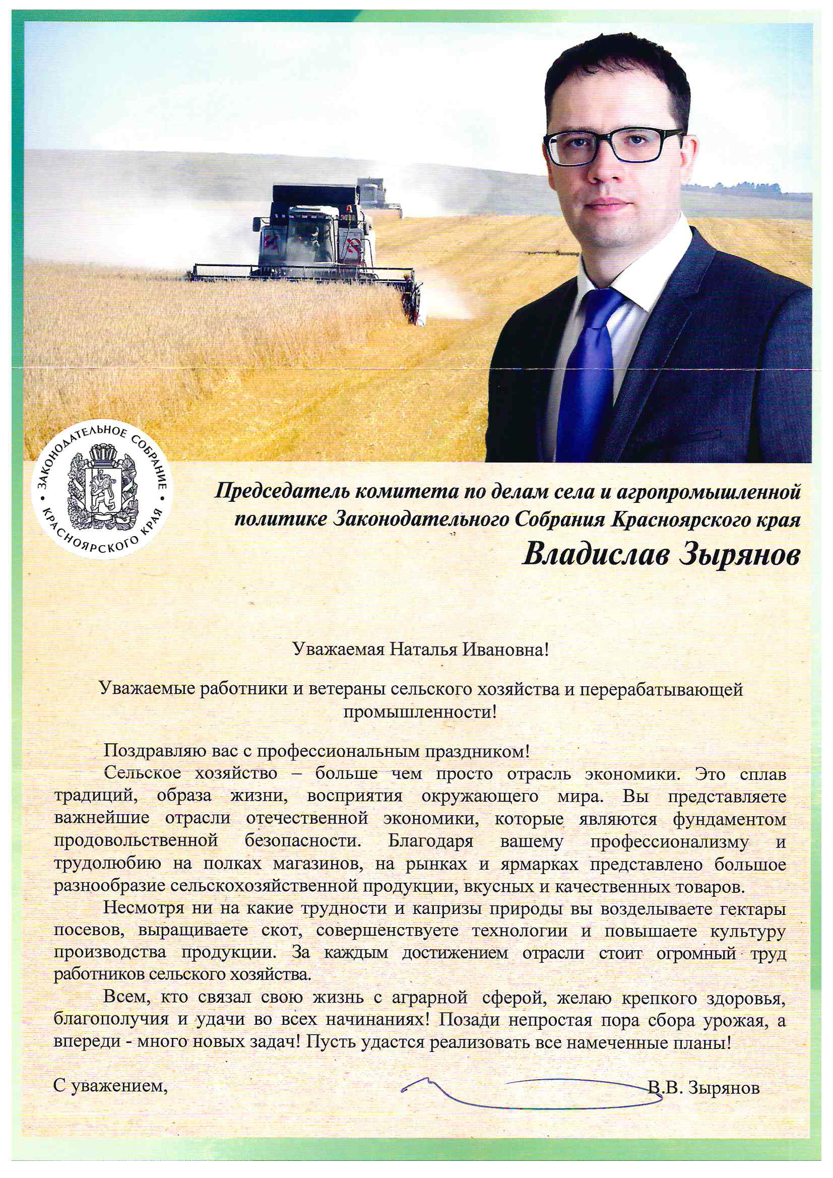 – В нашем университете учатся студенты, достигающие поставленных целей и достойно представляющие Красноярский ГАУ на всероссийской и межвузовской аренах. Благодаря вам я уверена в будущем нашей страны. Именно вы станете стержнем аграрного сектора края и сделаете большой вклад в процветание России.