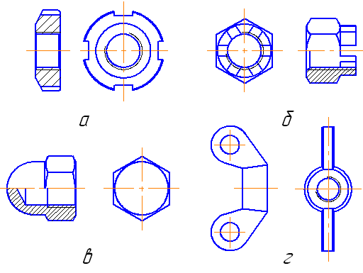 Гайка - деталь с резьбовым отверстием, используемая для крепления разъёмных соединений навинчиванием на стержень болта, винта или шпильки, а также для преобразования вращательного движения в механизмах в прямолинейное. По форме гайки выполняют: шестигранными, шестигранными прорезными, корончатыми (рисунок 9, б), круглыми (рисунок 9, а), колпачковыми (рисунок 9, в), барашковыми (рисунок 9, г) и т.д. По высоте шестигранные гайки различают нормальной высоты, низкие, высокие и особо высокие. Кроме того, гайки выпускают и с уменьшенным размером «под ключ». По типу резьбы различают гайки с метрической резьбой с крупным или мелким шагом.