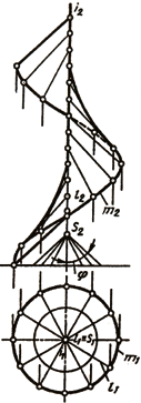 Наклонный геликоид образуется движением образующей по винтовой направляющей m и её оси i так, что образующая l пересекает ось i под постоянным углом φ, отличным от прямого, то есть в любом положении образующая l параллельна одной из образующих направляющего конуса с углом при вершине, равным 2φ (рисунок 11, б). Наклонные геликоиды ограничивают поверхности витков резьбы.