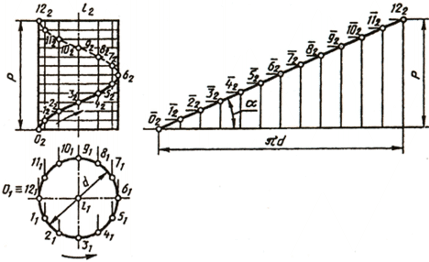 Для построения фронтальной проекции винтовой линии при заданном диаметре d и шаге р нужно разделить и окружность, и шаг на равное число частей. Построение проекций точки винтовой линии показано на рисунке 12. Цилиндрическую винтовую линию можно развернуть на плоскость. Развёртка её представляет собой прямую линию с углом подъёма α, где tg α = p/πd.