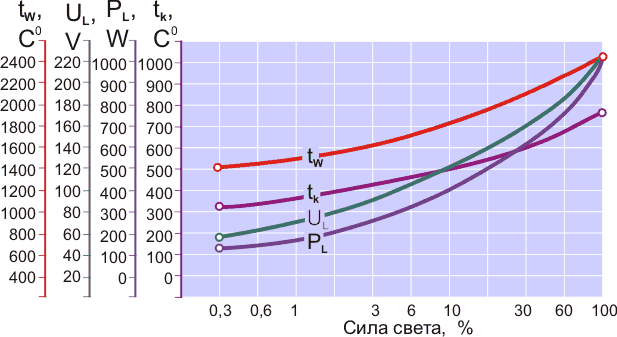 Важными экономическими показателями осветительных установок являются зависимость характеристик лампы - мощности, светового потока, тока лампы, светоотдачи, напряжения на лампе и срока службы от напряжения сети. Эти характеристики позволяют оценить как регулировочные возможности ламп, так и возможные потери светового потока (освещенности) и перерасхода энергии на освещение при значительных отклонениях напряжения.