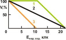 Возможная экономия электроэнергии при регулировании искусственного освещения в помещениях в зависимости от уровня наружной освещенности зависит от трех величин: коэффициента естественной освещенности помещения (КЕО) е; нормируемой освещенности Ен; вероятности использования естественного света V. Величина КЕО зависит от множества параметров - расположения и размеров светопроемов, светопропускания остекления и т. д. Интенсивность естественного освещения изменяется в течение дня внутри помещения в широких пределах. Значение КЕО для различных помещений может меняться от 1 до 12 %. При определении времени действия естественного освещения в помещении должна быть учтена та часть рабочего времени, для которой наружное освещение создает в помещении освещенность не ниже заданного значения Енар·е. Это значение зависит не только от наружной освещенности Енар, но также от географической широты места расположения освещаемого объекта, времени и продолжительности рабочего дня. Экономия электроэнергии за счет дискретного управления искусственным освещением может иметь место в тех случаях, когда