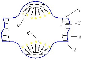 Принцип работы такой технологии заключается в испарении помещенного внутрь трубы взрывного стержня при подаче на него импульса напряжения и образовании необходимого объема газов. Образованные при взрыве газы разогревают и раздавливают полиэтиленовую втулку, вставленную в трубу, которая в свою очередь раздавливает трубу. Если труба на концах не имеет полиэтиленовой вставки и взрывного стержня и в концы вставлены упоры, например из текстолита, то они остаются без изменения и после обработки их диаметр становится меньше диаметра всей трубы. Схема раздачи труб показана на рис. 6.6.