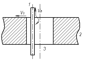 | Рис. 6.20. Схема шлифования проволочным электродом: 1-электрод-инструмент; 2-заготовка; 3-отверстие; Vп, Vз- скорость подачи и скорость перемещения проволоки и детали соответственно. |
