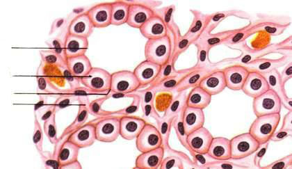Второй вид клеток - бокаловидные, светлые, с узкими ядрами и пенистой цитоплазмой,