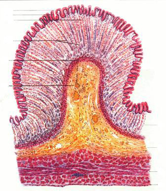 отдела состоит из оболочек: слизистой, подслизистой основы, мышечной и серозной. Слизистая оболочка не образует ворсинок. Общекишечные железы - крипты многочисленные и глубокие. Эпителий, покрывающий