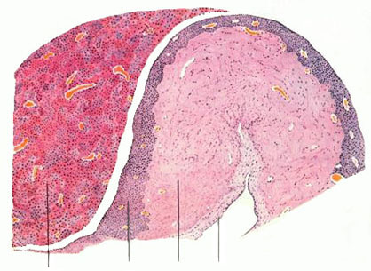 При малом увеличении на поверхности органа заметна капсула, она тонкая, образована соединительной тканью и представляет собой мягкую мозговую оболочку.