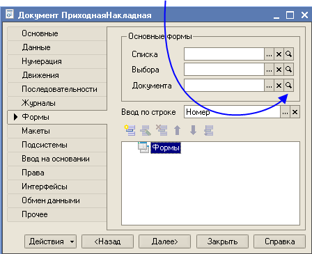 47. Создайте форму документа: в окне Конфигуратора выберите на дереве объект Документы, выберите ПриходнаяНакладная, М2, выберите вкладку Формы, выберите кнопку Лупа в поле Документа, должен запуститься конструктор форм, согласившись тем самым со всем, что нам предлагает система нажмите Готово.