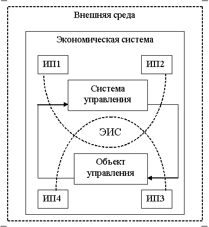 Структура экономической системы (промышленного предприятия, торговой организации, коммерческого банка, государственного учреждения и т.д .) с позиций кибернетики представлена на рис. 1.1, где основные информационные потоки между внешней средой, объектом и системой управления помечены метками над стрелками ИП 1, ИП 2, ИП 3, ИП 4 и связаны с поддерживающей их экономической информационной системой (ЭИС ).