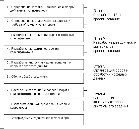На этом же этапе осуществляется разработка методик построения классификаторов, отражающих методы и последовательность выполнения отдельных операций по созданию классификаторов, содержание которых зависит от выбранных критериев и принципов их построения.