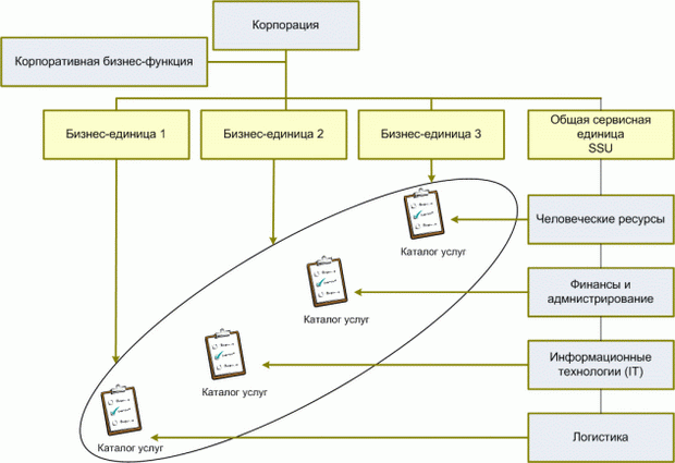 Такие деловые функции как финансовое управление, IT, управление персоналом и логистика не всегда являются основой конкурентного преимущества. Отсюда руководителю организации и топ-менеджерам не обязательно контролировать и управлять ими. Вместо этого услуги таких функций объединяются в отдельную сервисную единицу - Общий поставщик услуг (Service Shared Unit или SSU). SSU(рис. 2.4) как поставщик услуг обладает большей свободой, чем поставщики первого типа. Он может создавать, развивать и поддерживать внутренний рынок сбыта своих услуг аналогично поставщикам, которые работают на свободном рынке. В то же время SSU может использовать возможности корпорации аналогично поставщикам первого типа. Таким образом, SSU находится на пересечении первого и третьего типов.