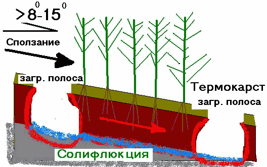 Схема развития термокарста и солифлюкции в лесах на вечной мерзлоте при прокладке минерализованных заградительных полос для локализации лесного пожара