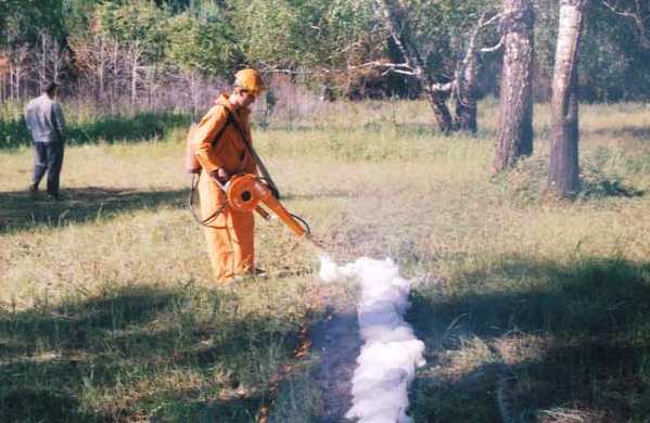 Орудие на базе бензопилы для сбивания пламени лесного низового пожара низкой интенсивности высокоскоростной воздушной или воздушно-жидкостной струей, прокладки, пенных или смоченных опорных полос, раздувания пламени при отжиге (воздуходувки ВЛП-20)
