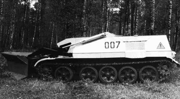 Агрегат лесопожарный танковый АЛТ-55 (рабочее положение клина) может прокладывать заградительные полосы в древостоях любой полноты в режиме непрерывного движения со скоростью до 10 км/ч