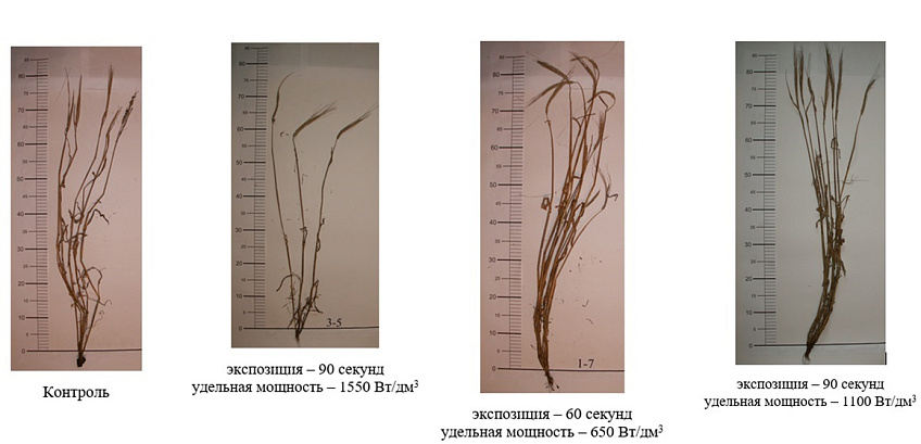 Рис. 1. Ячмень Ача перед уборкой урожая (сравнение режимов предпосевной СВЧ-обработки с контролем)