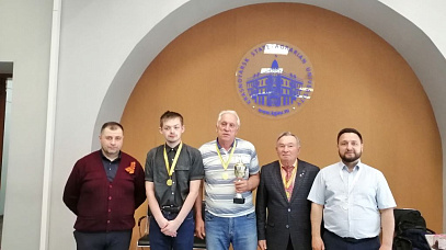 Капитан команды КрасГАУ по шахматам к.т.н., доцент Васильев Александр Александрович в центре с кубком ИИСЭ, справа д.б.н., профессор Смолин Сергей Григорьевич ИПБ и ВМ и аспиранты Института экономики и управления АПК.